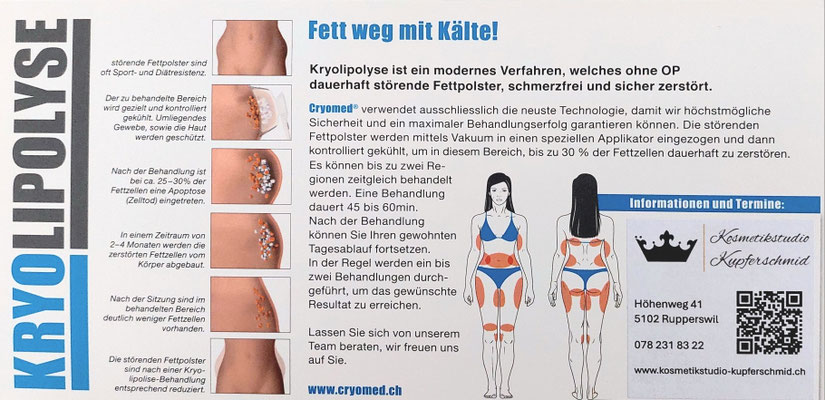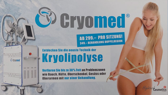Kryolipolyse ist eine schmerzfreie Behandlung zur Fettreduktion an Bauch, Hüfte, Oberschenkel und Oberarmen ohne Operation. Es ist eine Fettreduktion von 20-30% möglich.